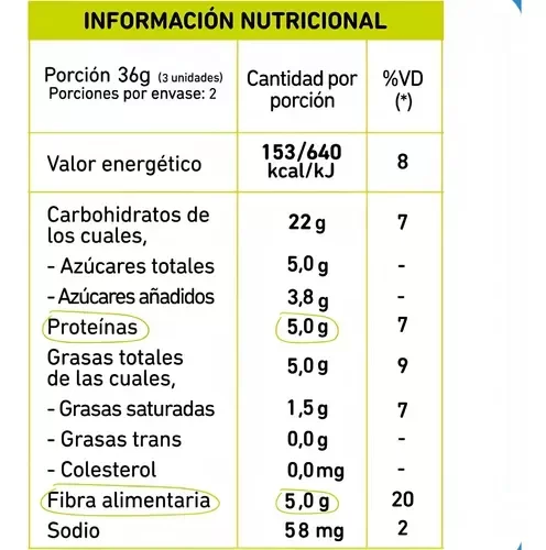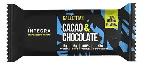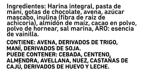 Harina integral, pasta de maní, gotas de chocolate, avena, azúcar mascabo, inulina (fibra de raíz de achicoria), almidón de maíz, cacao en polvo, polvo de hornear, esencia de vainilla, sal marina. Puede contener: CEBADA, CENTENO, AVELLANA, NUEZ, CASTAÑAS DE CAJÚ, DERIVADOS DE HUEVO, LECHE Y SOJA.